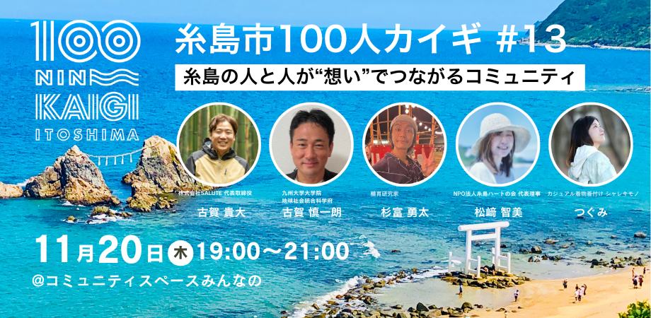 次回、糸島市100人カイギは11/20(木)にコミュニティスペースみんなので開催です。ぜひお越しください!