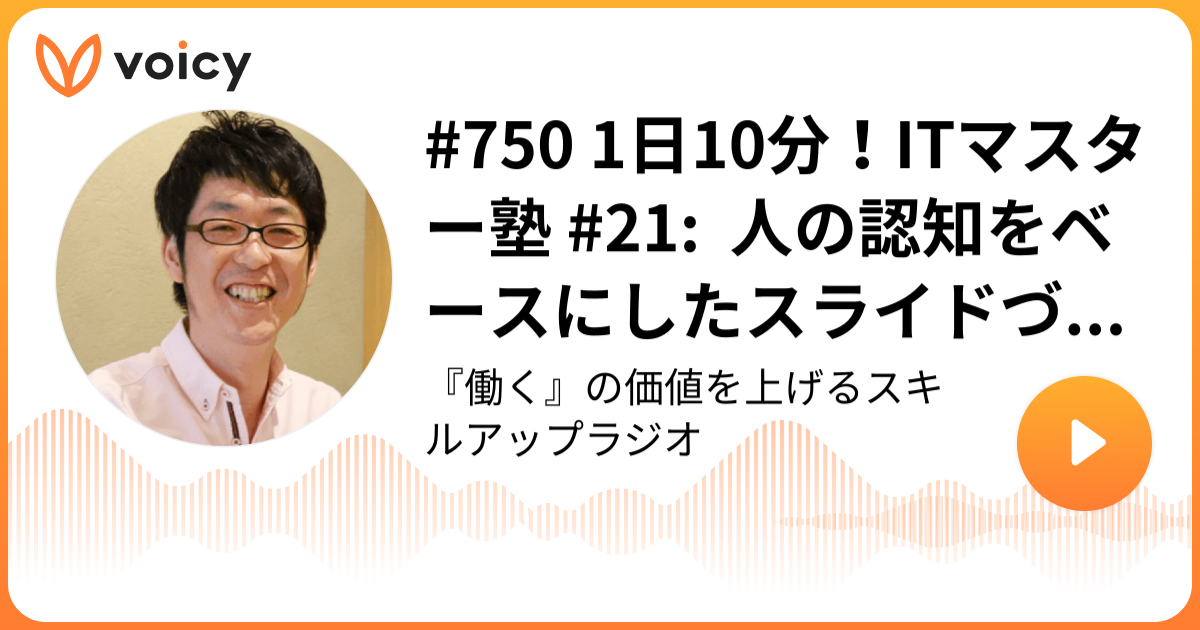 今日はVoicy「スキルアップラジオ」の放送から「1日10分!ITマスター塾 #21 人の認知をベースにしたスライドづくりの2つのルール」をお届けしました。