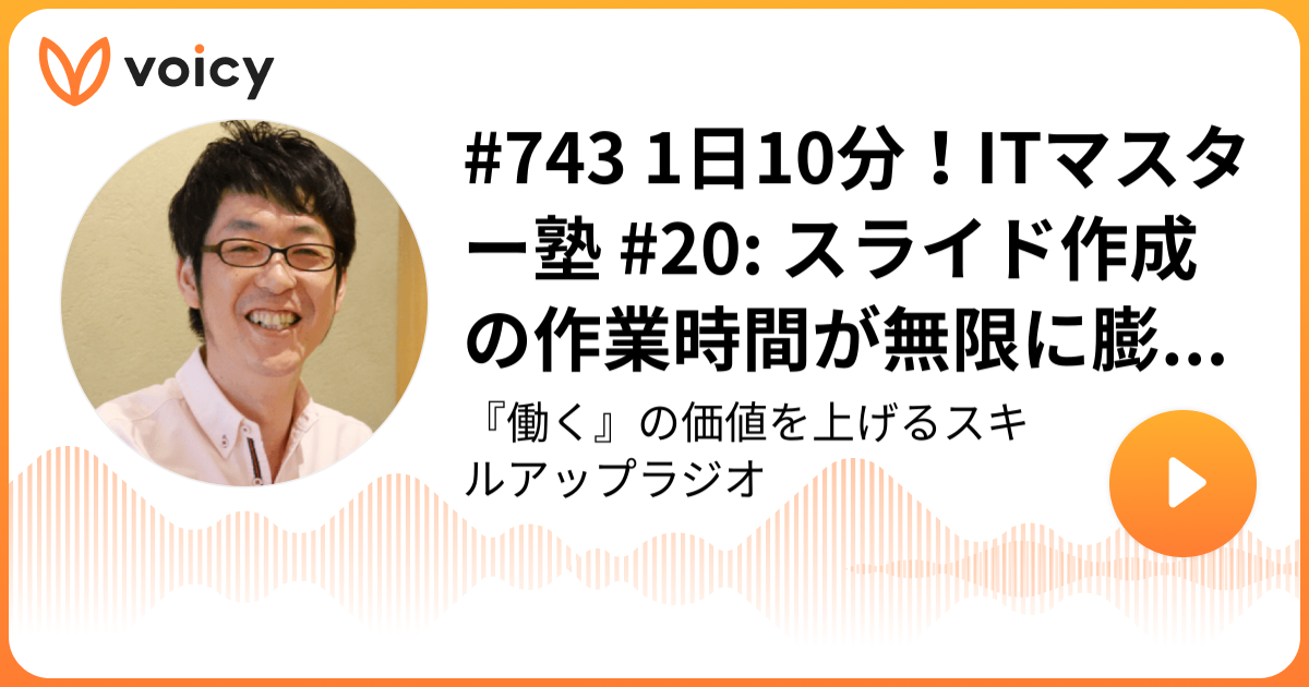 743回の放送1日10分。ITマスター塾第20回スライド作成の作業時間が無限に膨らむ問題をどうするかという話題をお送りしました。