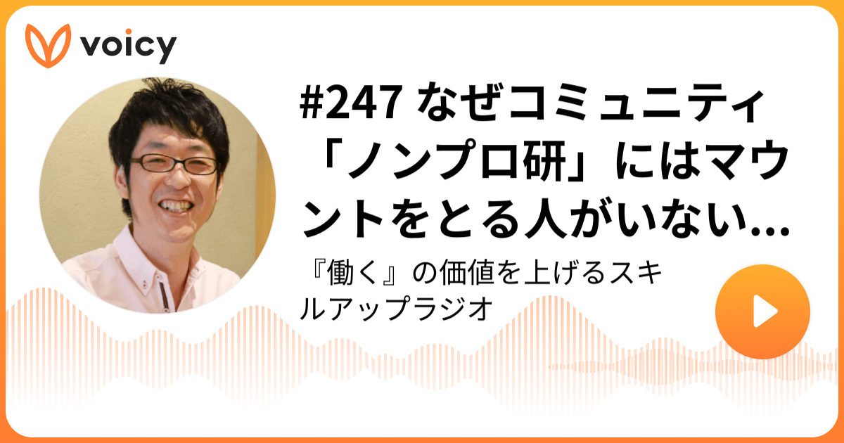 ということで、今日はVoicy「スキルアップラジオ」の放送から「なぜコミュニティ「ノンプロ研」にはマウントをとる人がいないのか?」をお届けしました。
