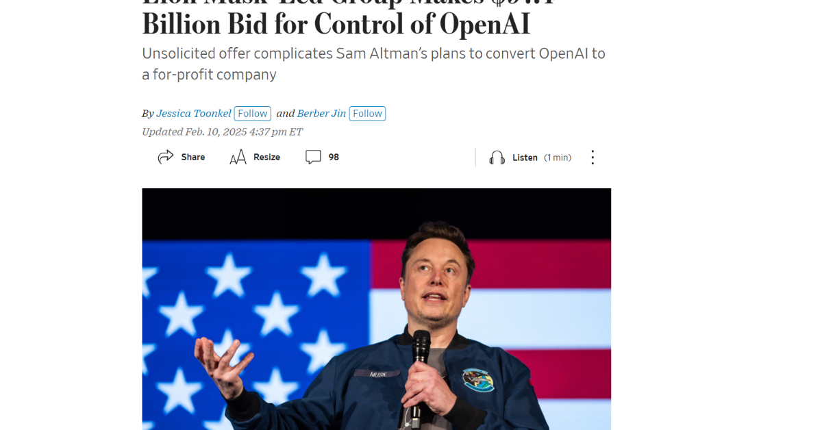 イーロン・マスク氏が率いる投資家グループが、人工知能(AI)企業OpenAIの非営利部門を974億ドルで買収する提案を行いました。