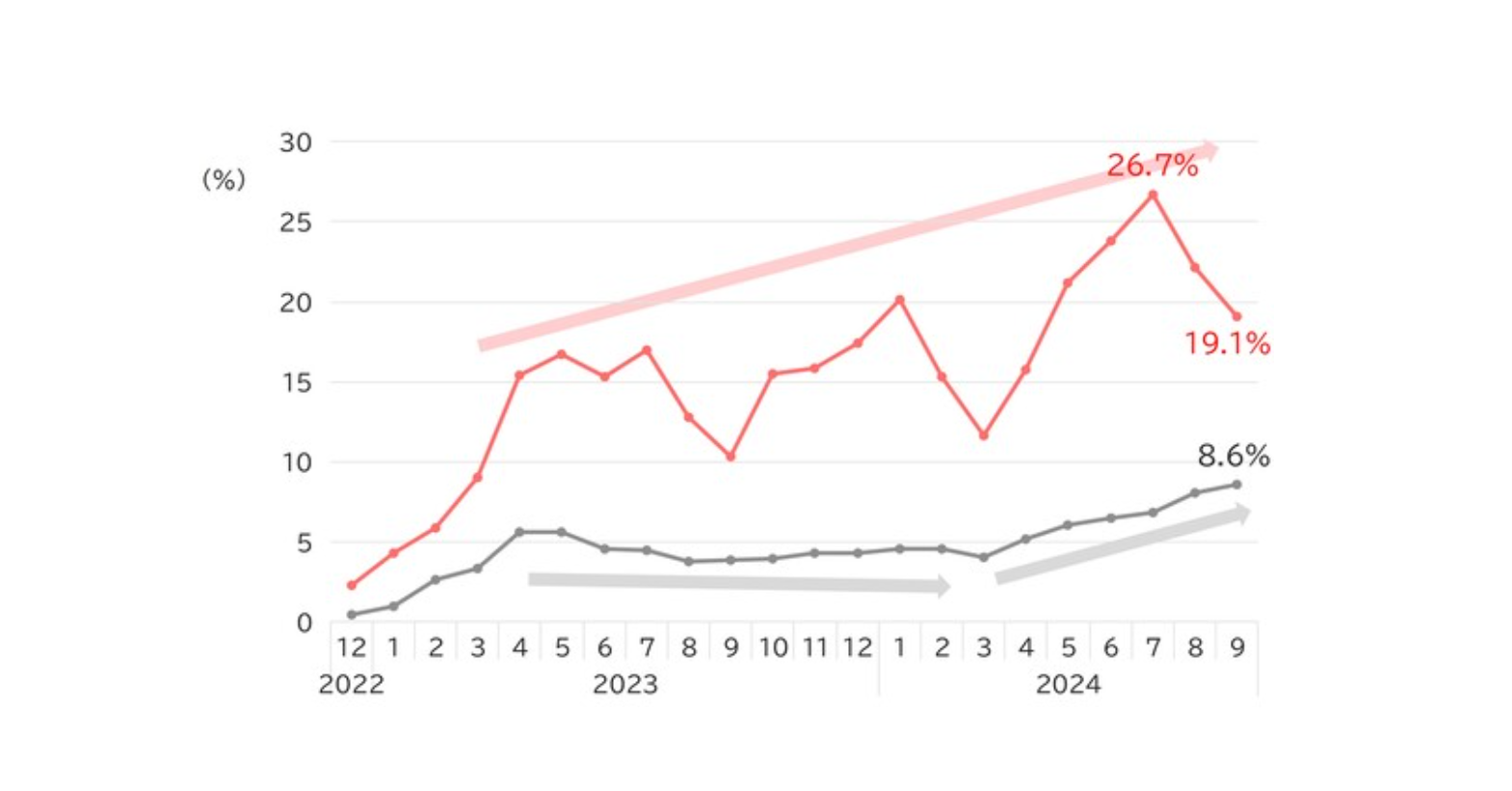 インテージが発表した調査結果によると、生成AIの利用率は徐々に上昇しているものの、一般生活者全体での普及は限定的であることが分かりました。2024年9月時点で一般生活者全体の月間利用率は8.6%にとどまっています。一方で、学生の利用率は19.1%と高く、社会人の13.1%を大きく上回っています。特筆すべきは、学生の利用率が季節により大きく変動していることです。利用率が最も高かったのは2024年7月で26.7%に達しました。